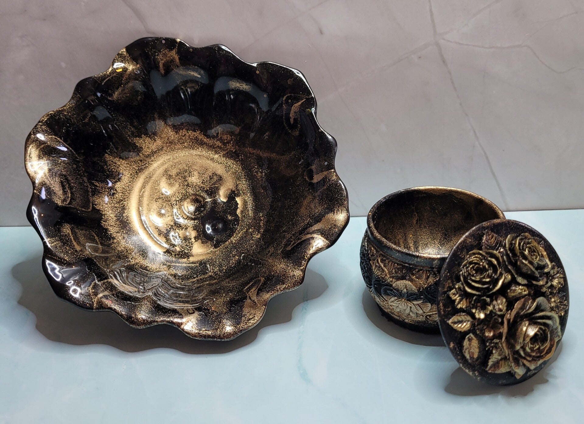 Your bedroom or your bathroom with sparkle in elegant Black and Gold.... This stunning set includes a round Bow box about 5" round, and 2" deep with the Bow Lid. A Rose Trinket Box measures about 2" round, 1 3/4" deep with a decorated rose lid. A what-not flower bowl measuring about 5" wide. To complement the entire package a perfectly fitted Tray measuring about 9" x 6" x 1" deep.