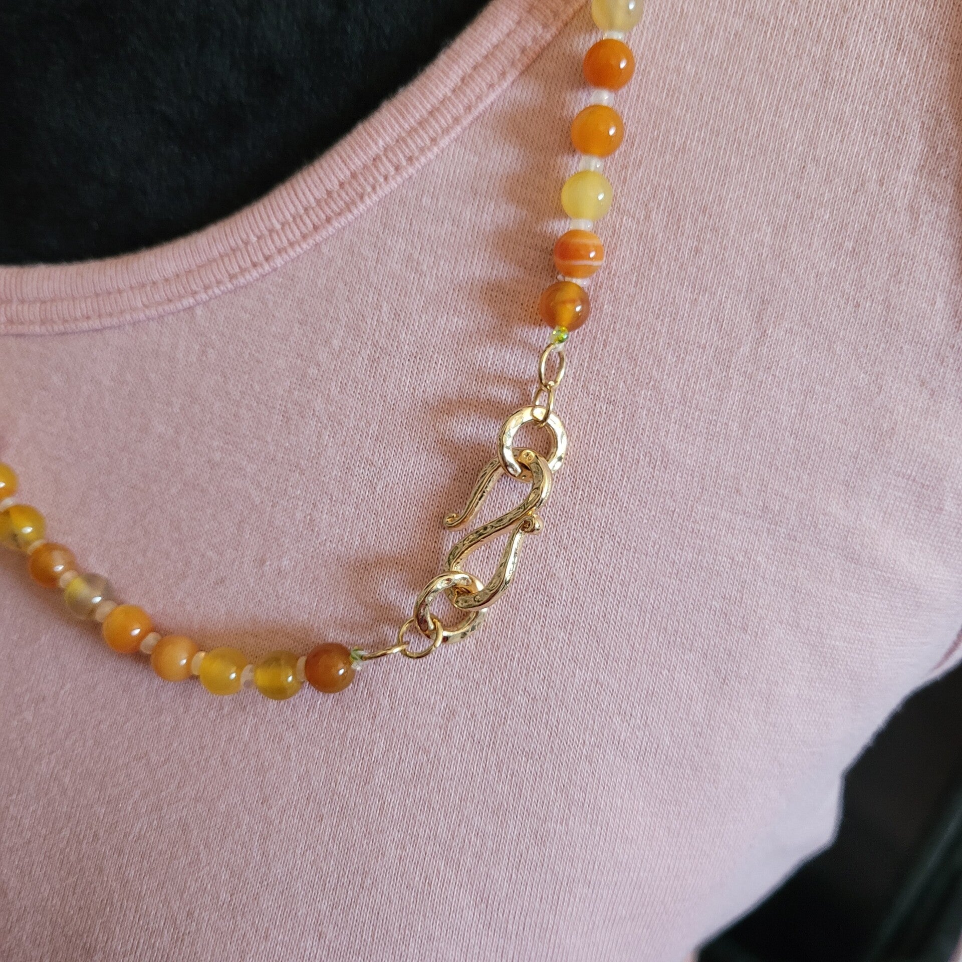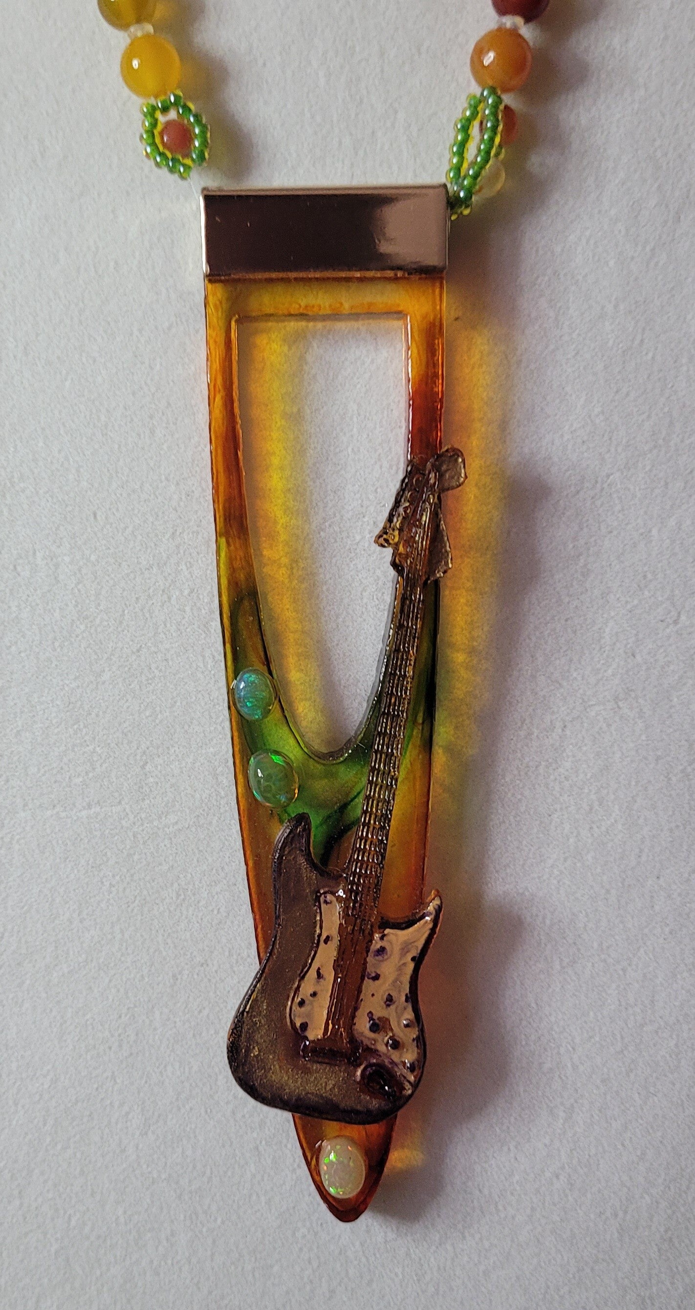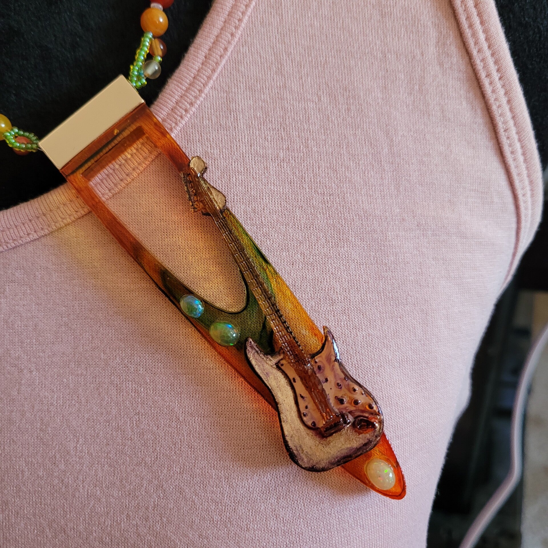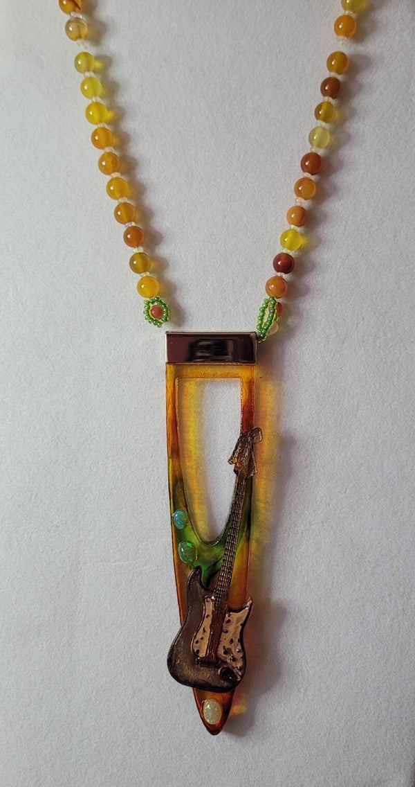 Golden Orange Handcrafted Resin "Dager" Style Necklace w/Colorful Opals and Electric Guitar