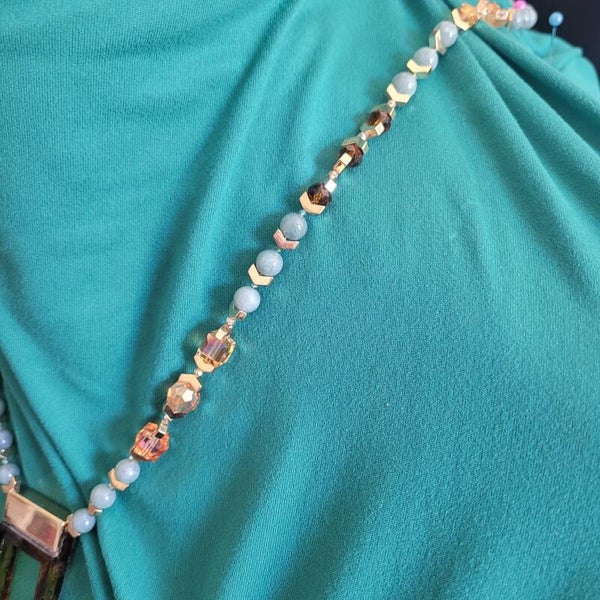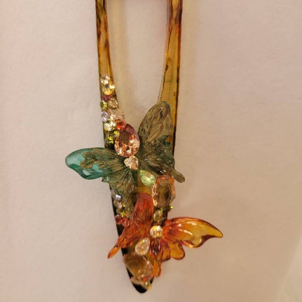 Edgy and Beautiful. Designed one tiny step at a time. Each Jewel placed separately adorning 2 sweet little butterflys on the 4" elongated Art Resin piece with a beaded necklace that includes jade beads plus more sparkle and golden accents.
