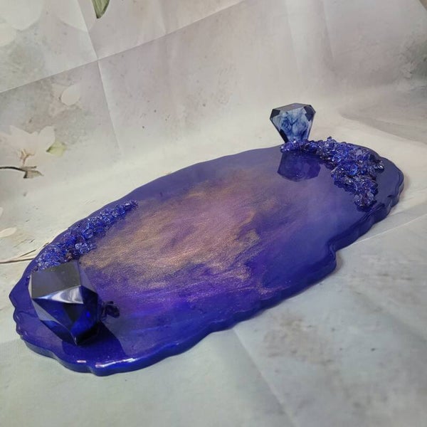 Edgy, Elegant, and Handcrafted. Stunning "Geode" Style Large Tray and "Geode" Resin coasters. The tray's finished element is deep blue crystals at each end and large crystals for your handles.