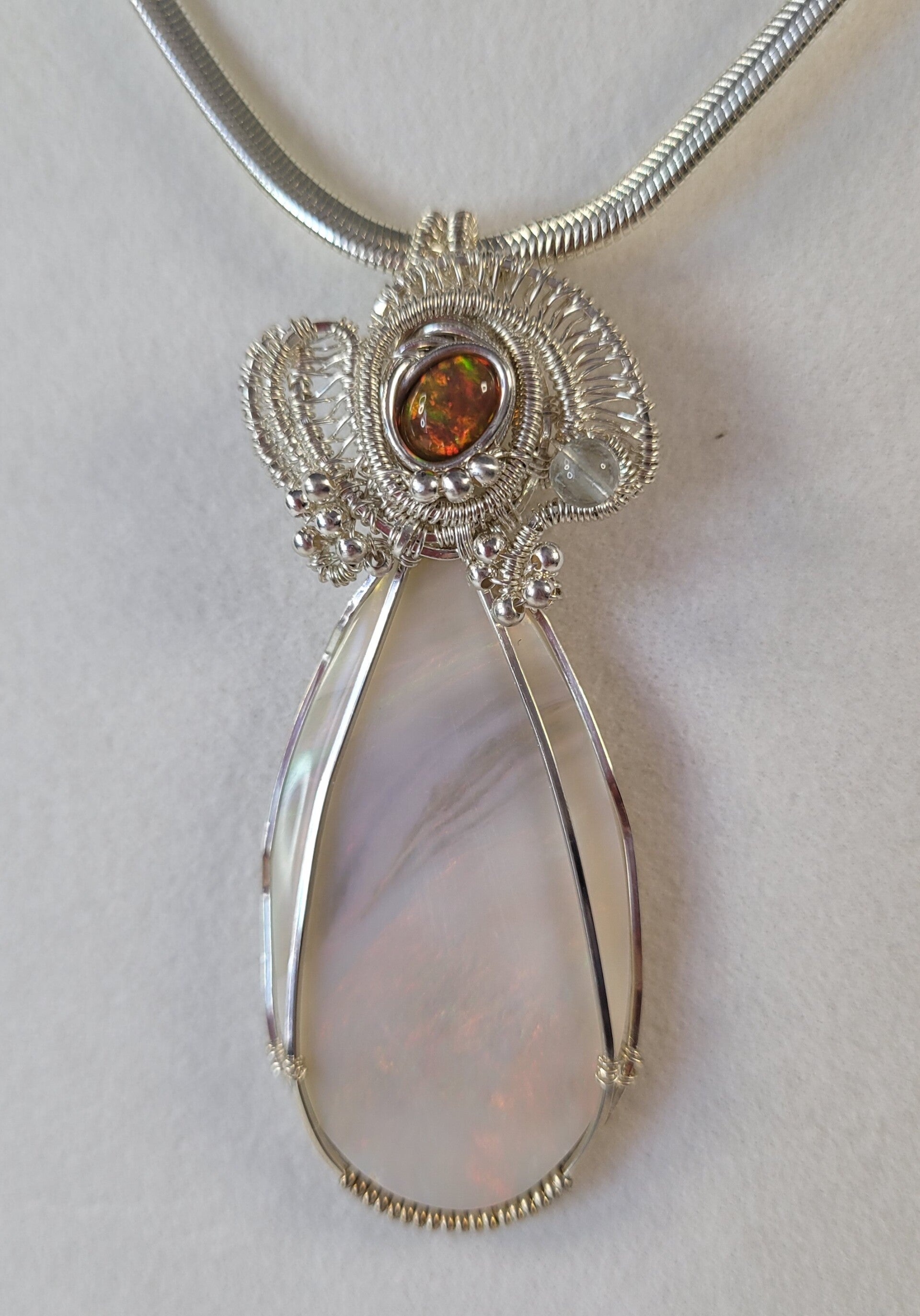 Stunning Firey pale pink opal cabochon. Sterling Silver Wire Weave created the Artisan Elegance showing off the Pink Opal. Including a solid Silver plated NECKLACE that you can wear separately, if you like. 2 necklaces in one!