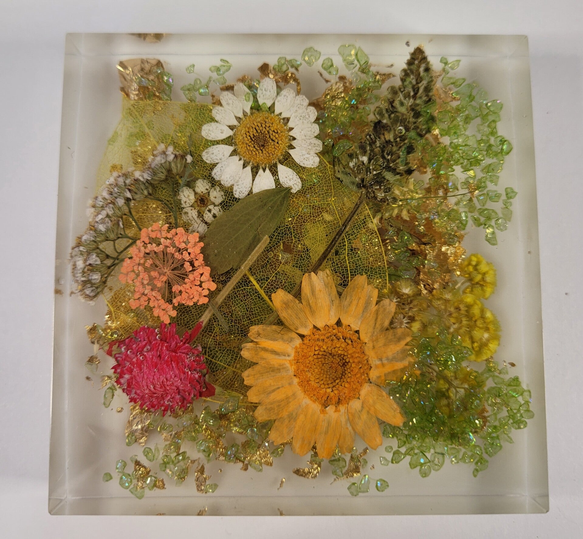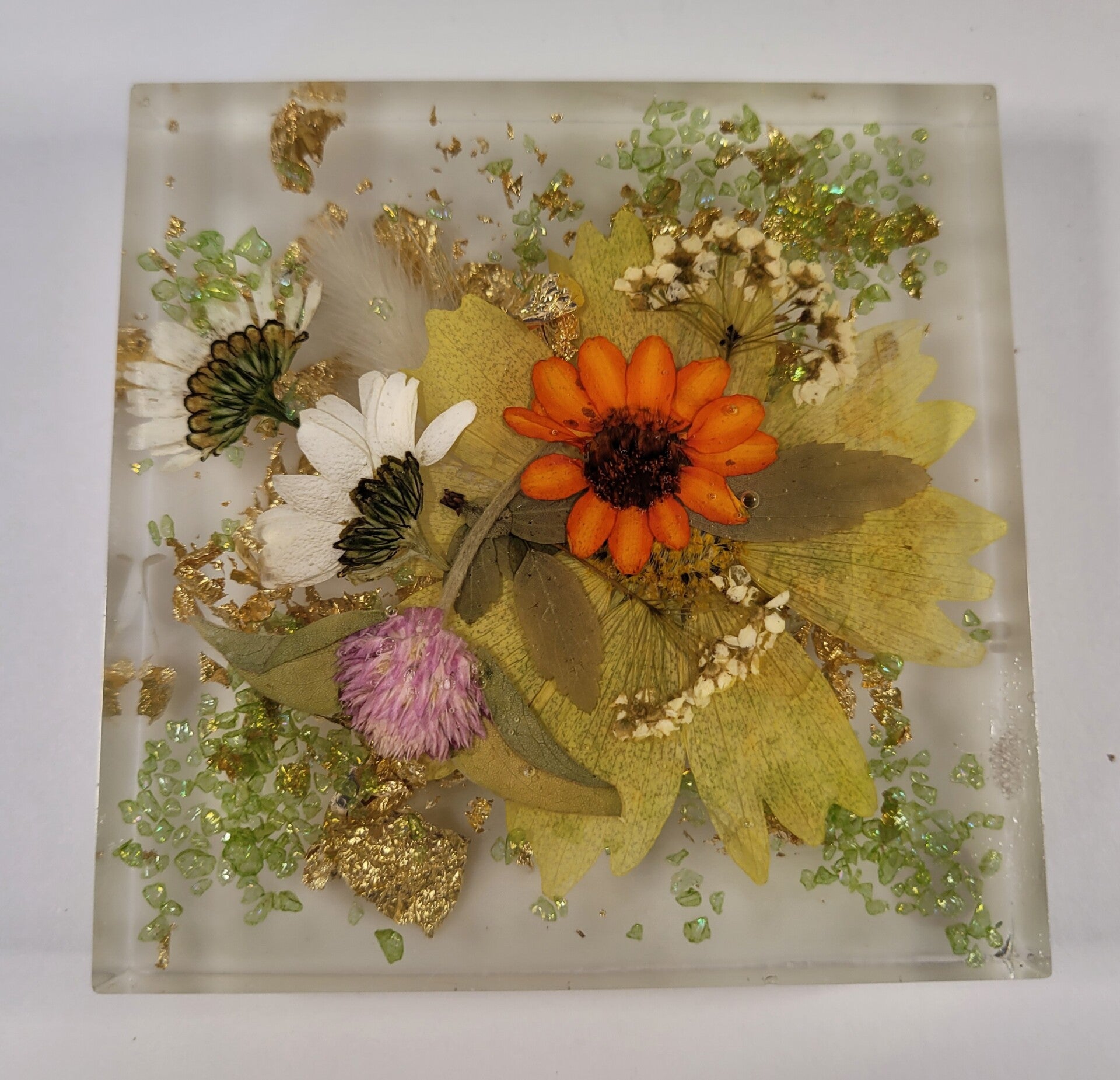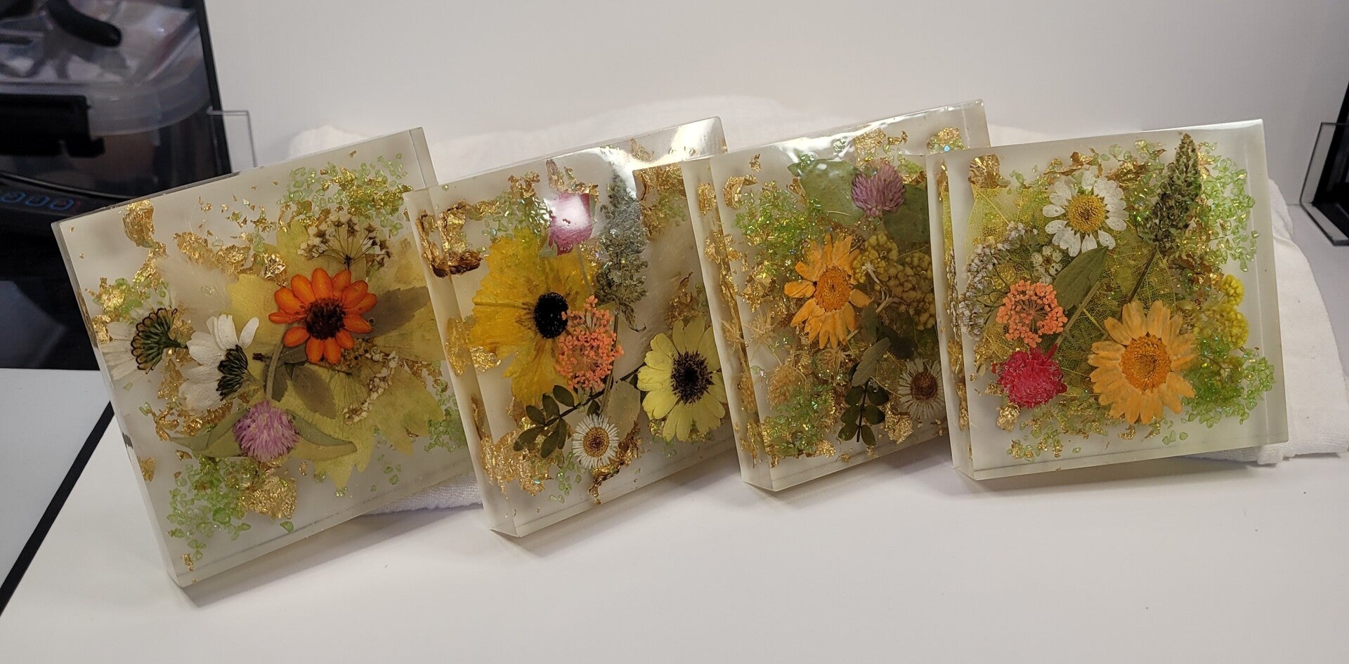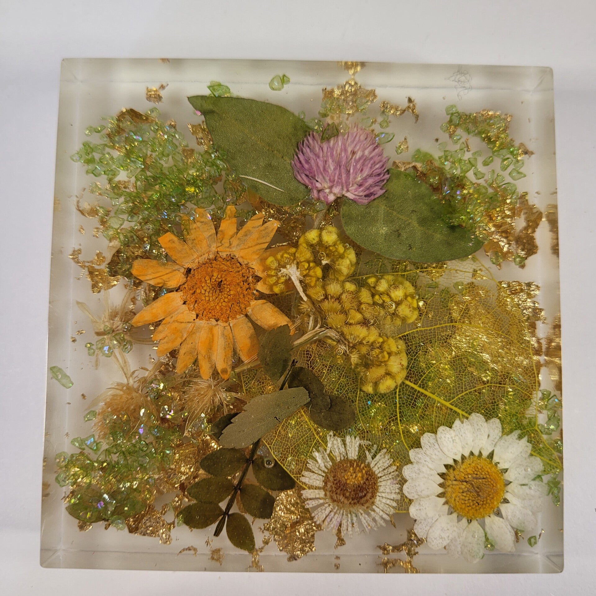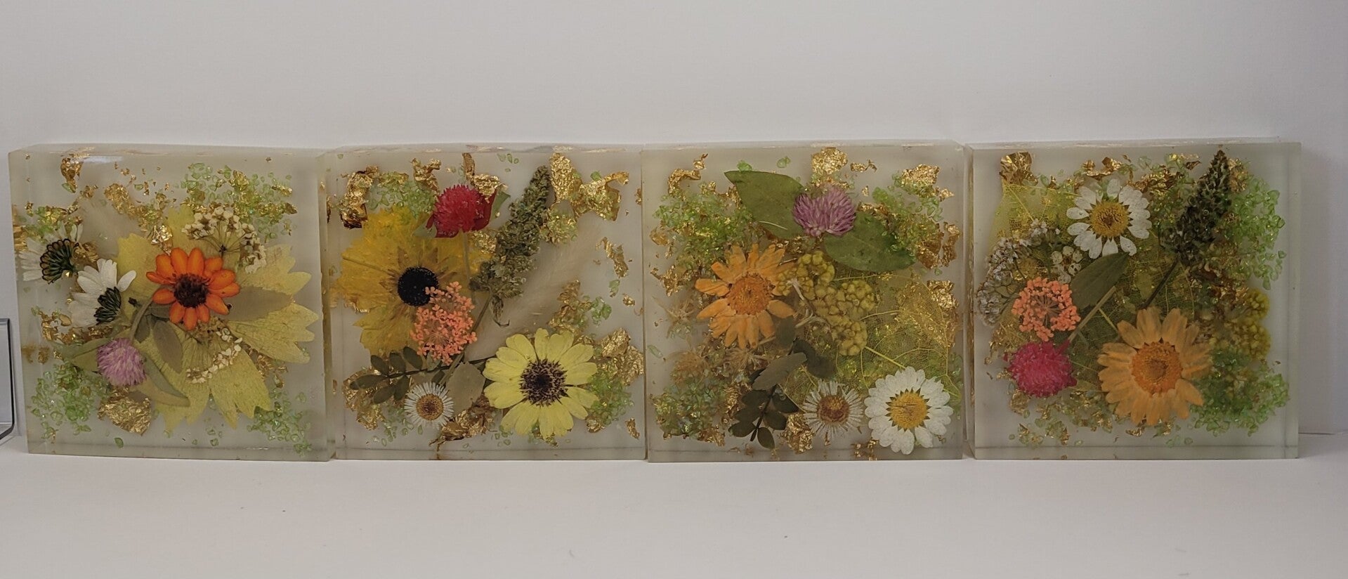 These handcrafted coasters have inset dried flowers and Golden accents. They are thicker, measure 4" x 4". They have small cork circles, that stop marks on your counter tops and furniture.