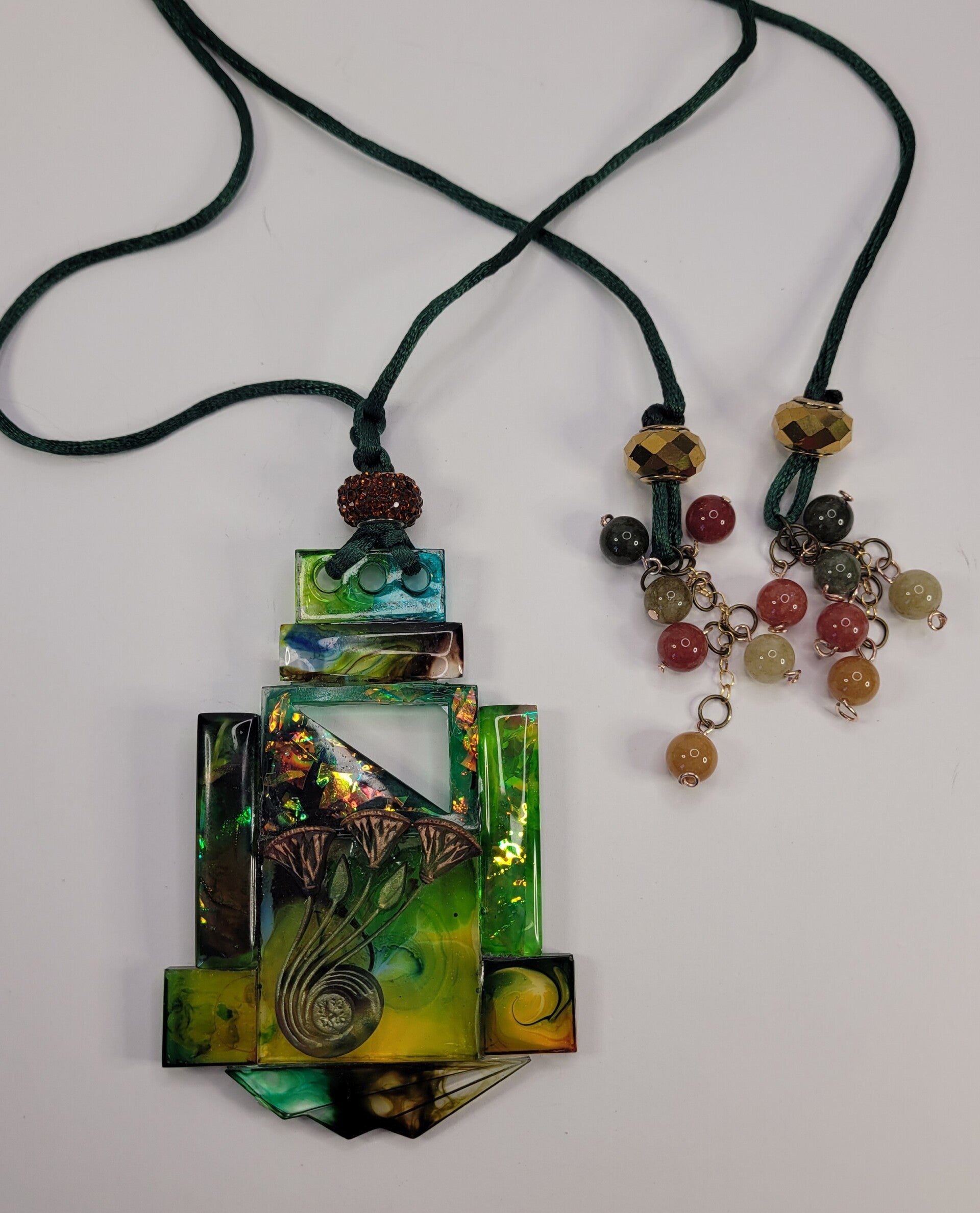 Resin Art Handcrafted piece by piece. The entire pendant is Shades of Green with special sparkle and added floral. The entire piece is abstract and unique. You can adjust the length by a slide pull.