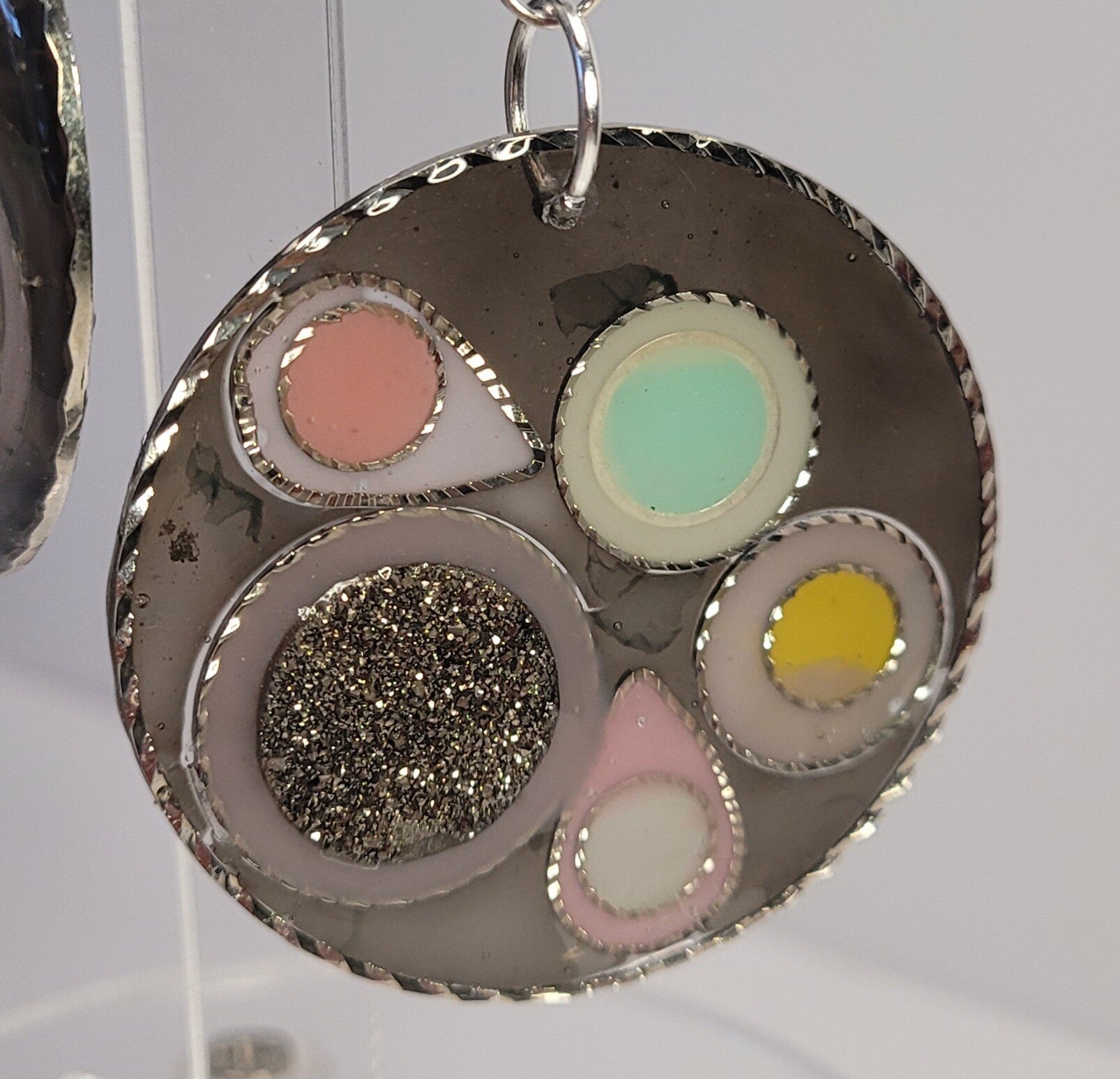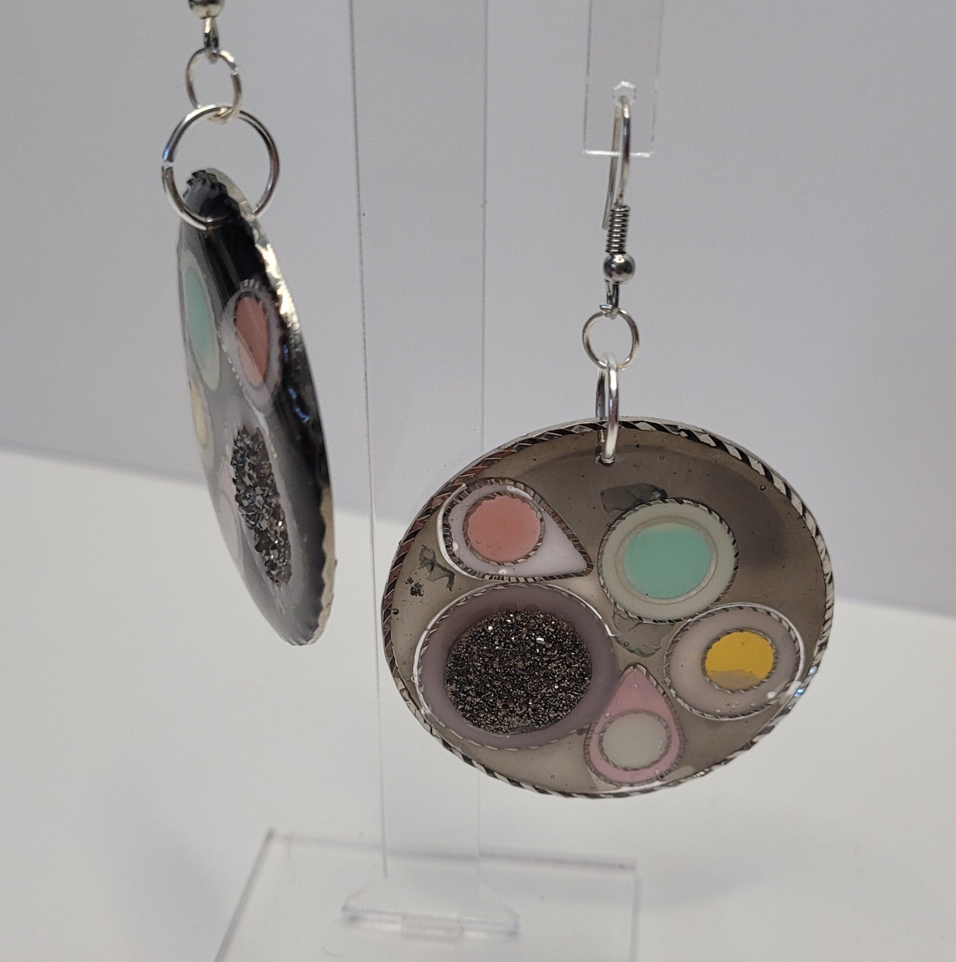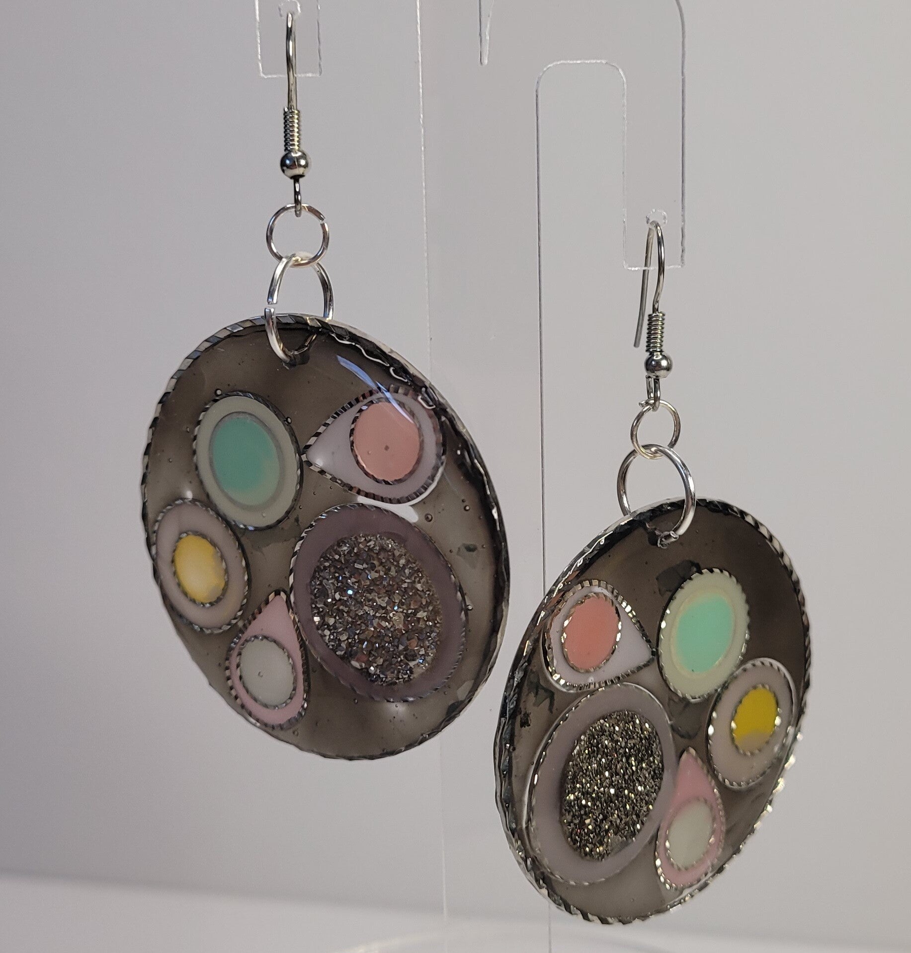 Using all Silvertone Circles to create these funky colorful earrings in Resin. Besides all the different Resin colors, you will notice sparkly genuine Black Druzys on each earring. These are the perfect earrings when your not sure what color you want to wear, plus they are great for any jewelry collection.