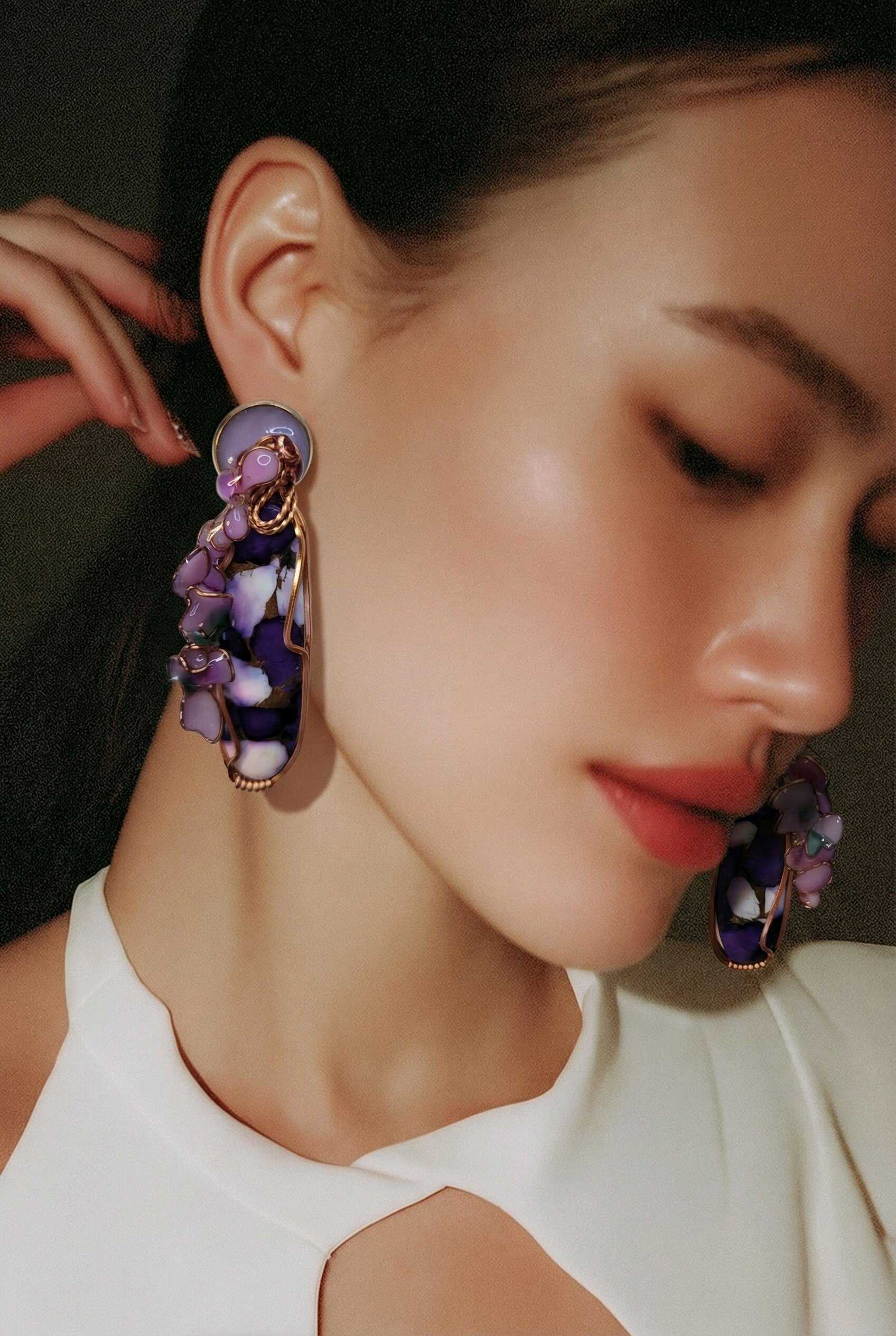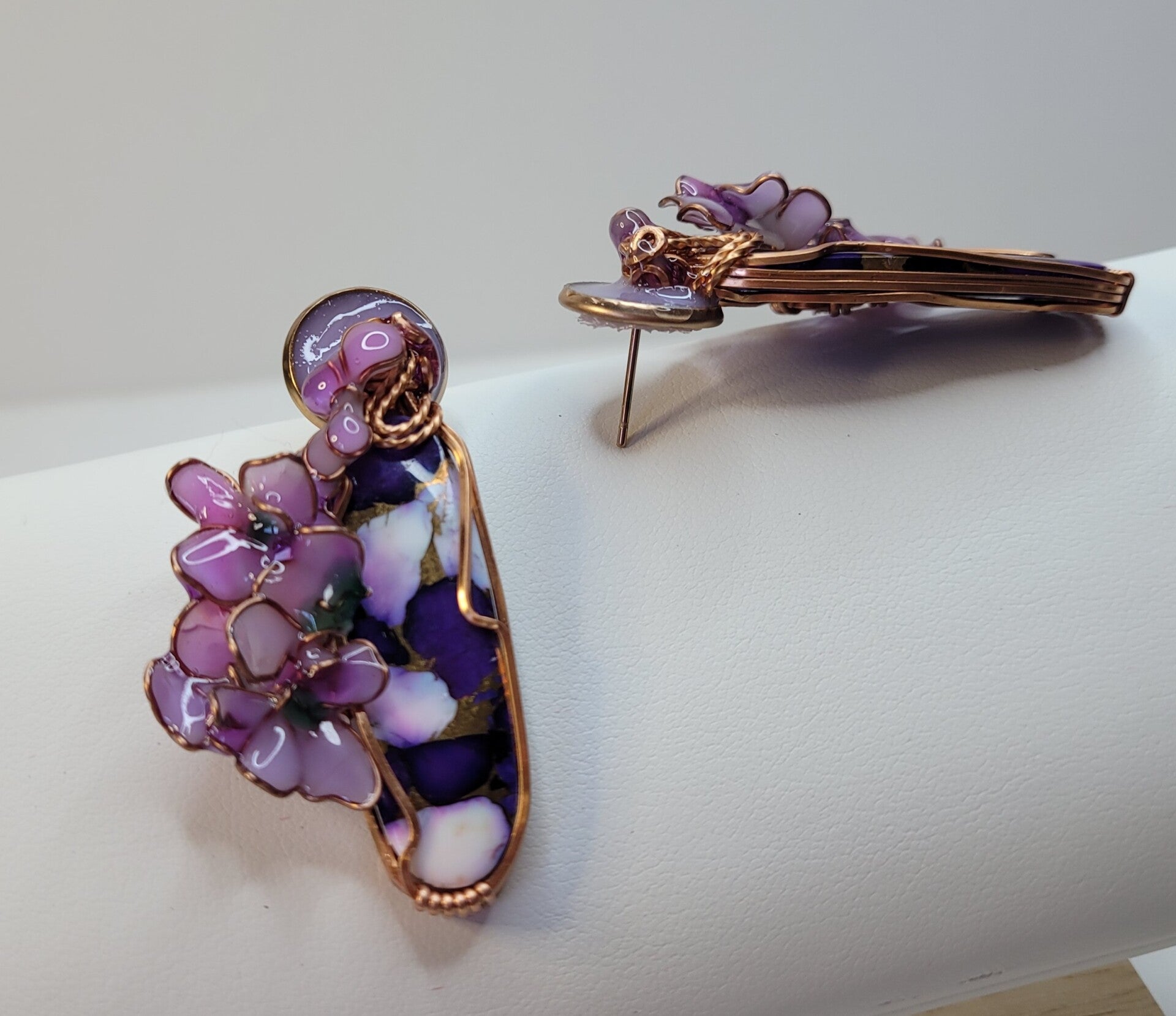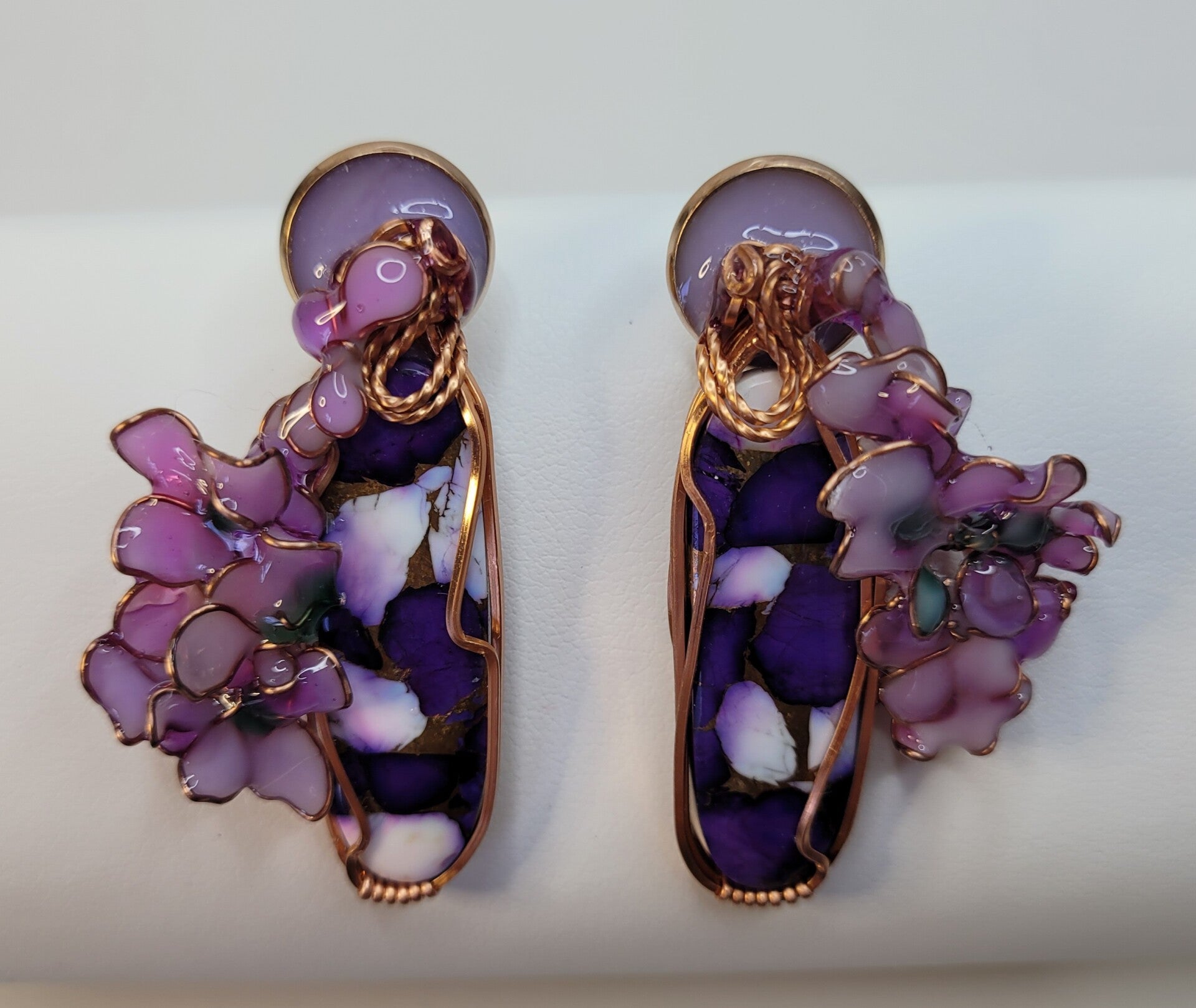 Each Earring starts with Kingman Purple Turquoise Matrix Cabochon. Then I added my creations of Purple and Lavendar Floral Sprays with Wire and Resin. Each Cabochon is captured in Copper Wire.