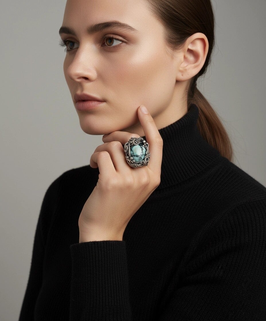 Make your day with this Fashionasble Designer Ring! Presenting Houbei Turquoise Cabochon and .925 Antiqued Sterling Silver Wire Weave Ring. Definately a statement piece.