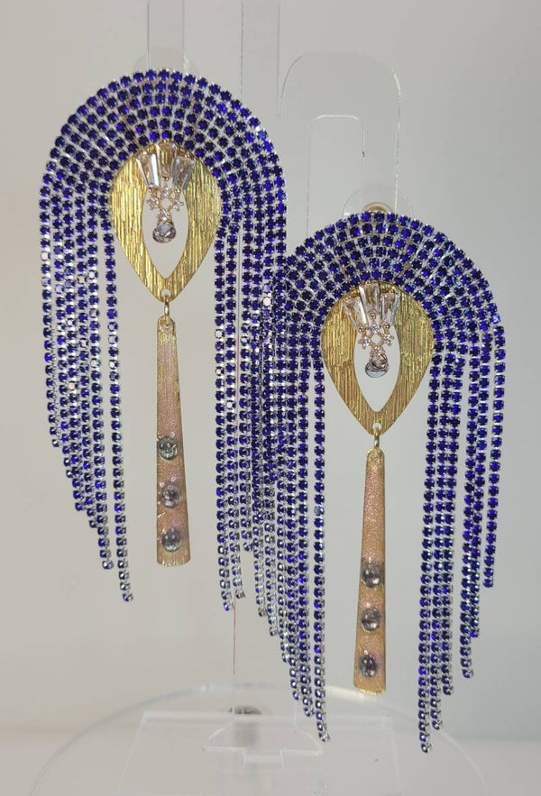 Chic Artistic Gold with Blue Fringe Dangle Earrings. Very Special Tiny Genuine Tanzanite Cabochons Adorn the center Drop. Artistry for you!