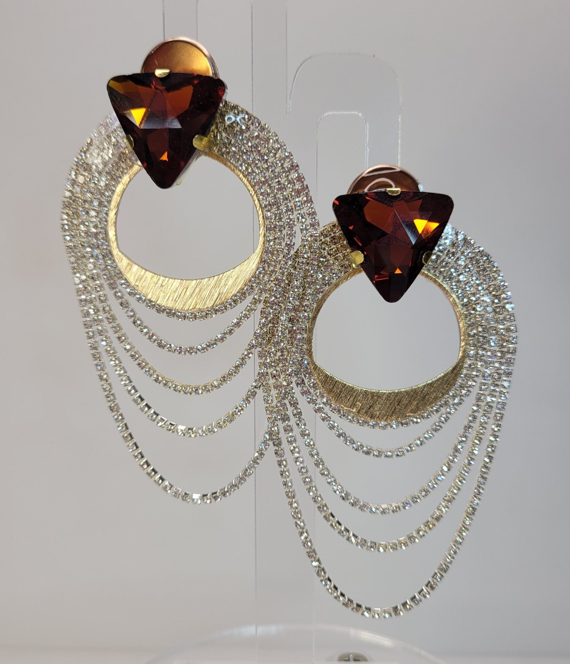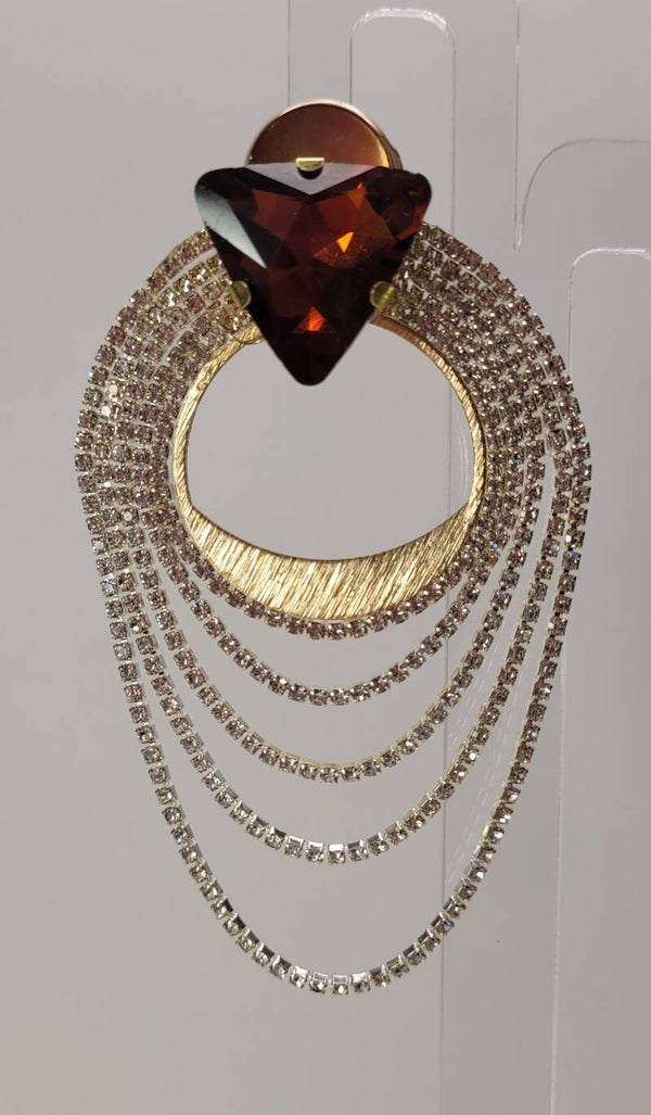 Stunning Artistic combination of Golden Center Circle surrounded by Sparkling Rhinestone Fringe set off with a Large Smoky Brown Glass Triangle.